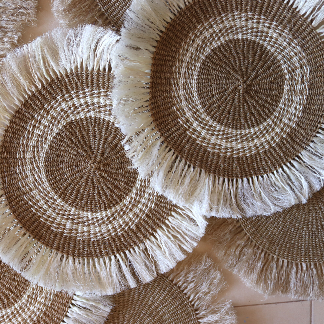 Boho placemats| Natural with white circle pattern | Sisal mats with fringe