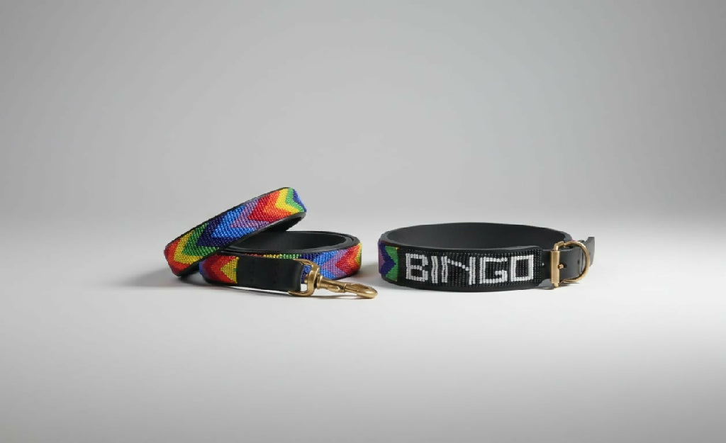 Hand-Beaded Leather Dog Collar & Leash - Rainbow