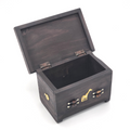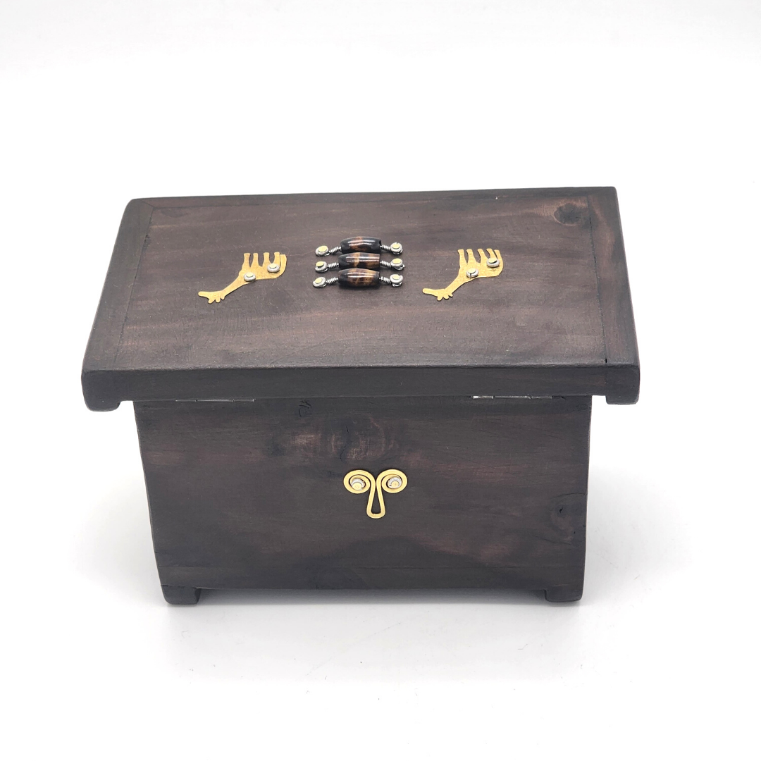The chest  box is made of wood and stained ta have a dark look. It is artistically decorated with brass trinkets and beads giving it a traditional yet modern feel.