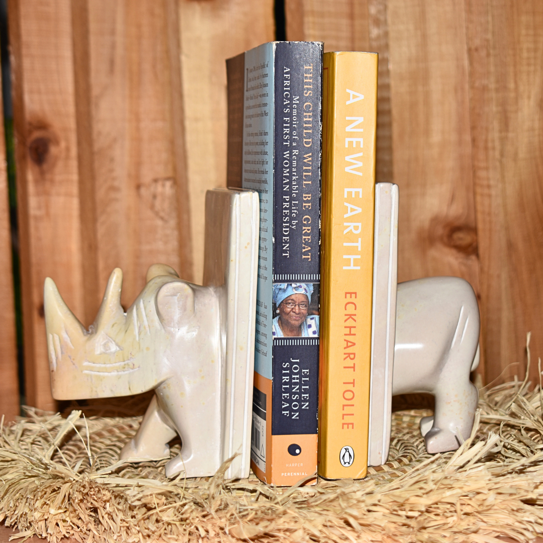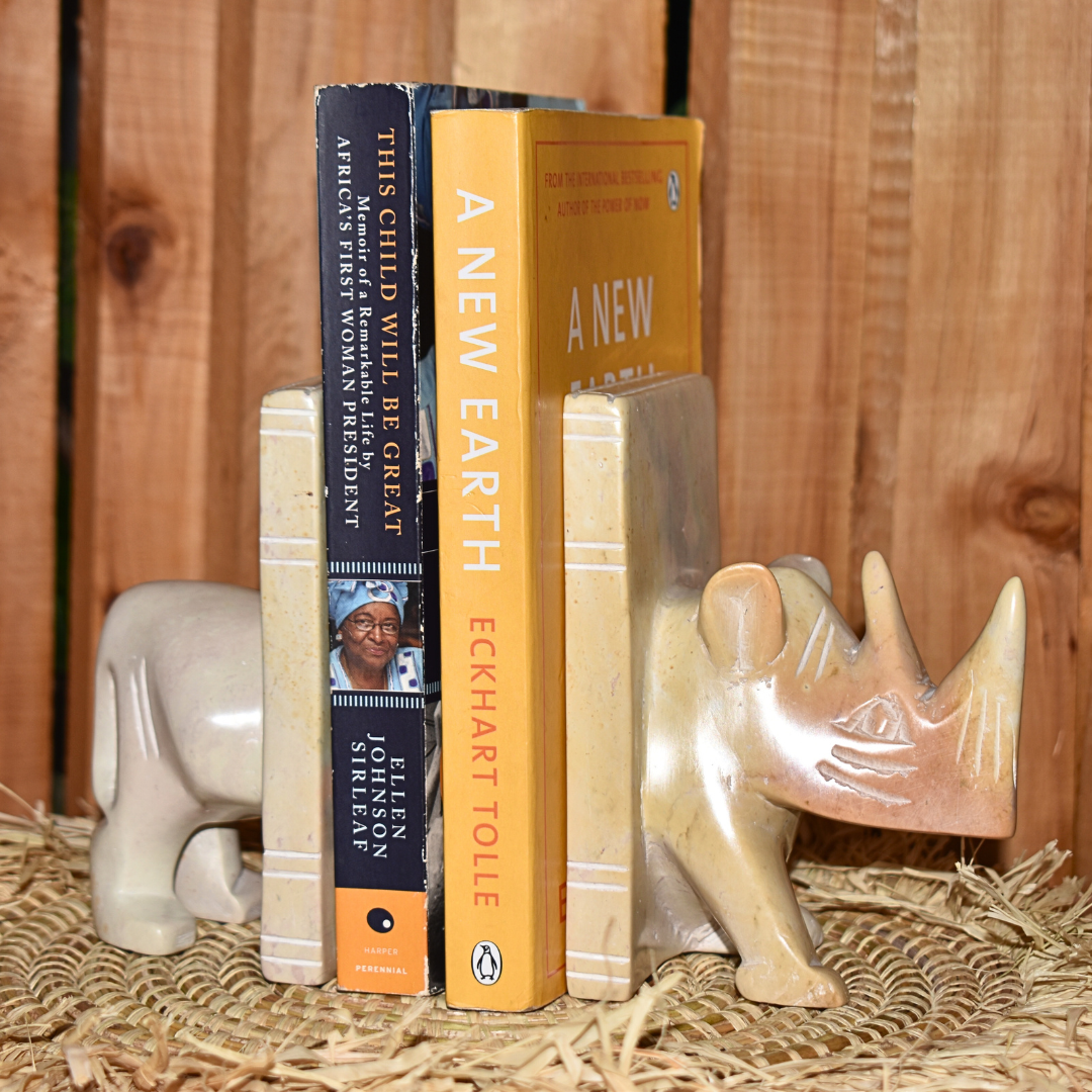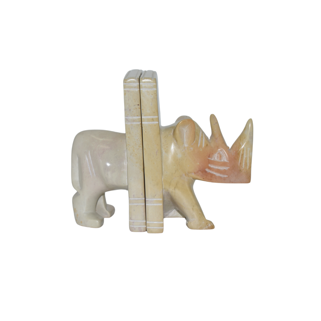 The natural color of the soapstone adds an organic and timeless touch to your space, seamlessly complementing any decor style. Adorned with a beautifully sculpted African rhino, this book holder becomes more than just a support for your favorite reads; it becomes a symbolic representation of strength and resilience.