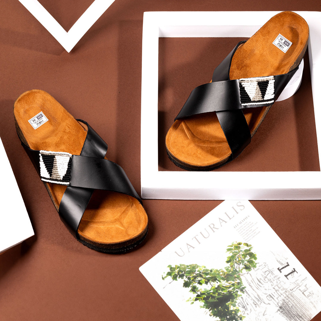 Men Leather Cork Sandals | African Beaded Sandals | Black and White