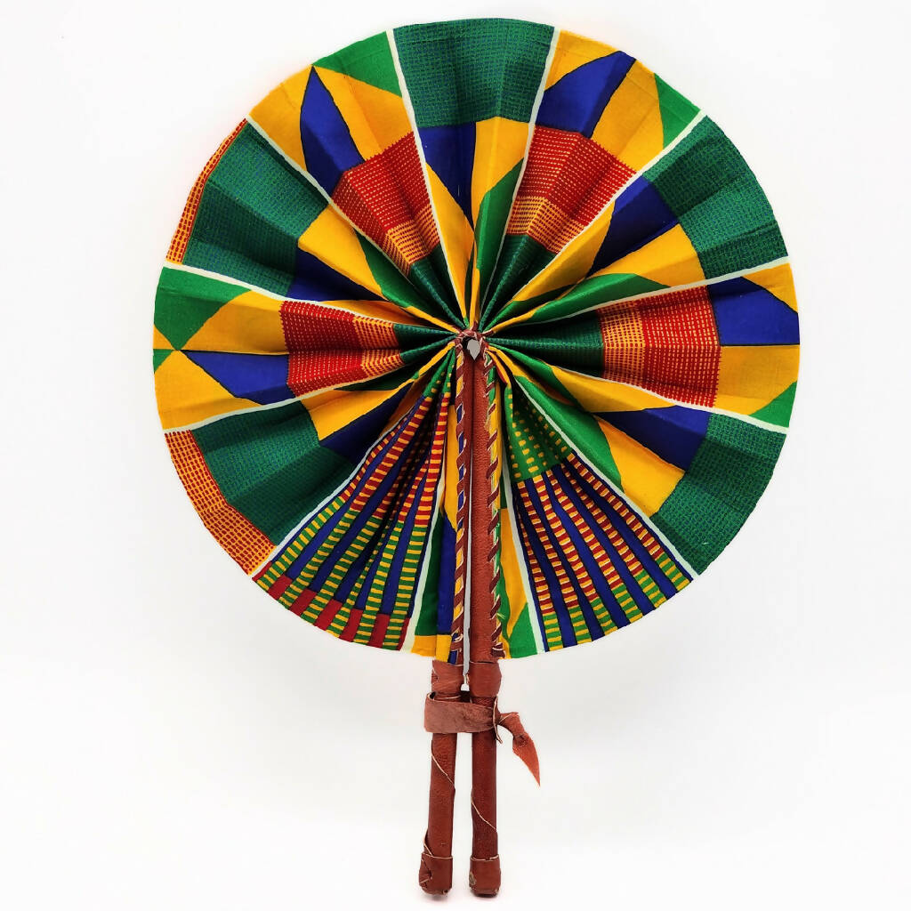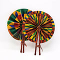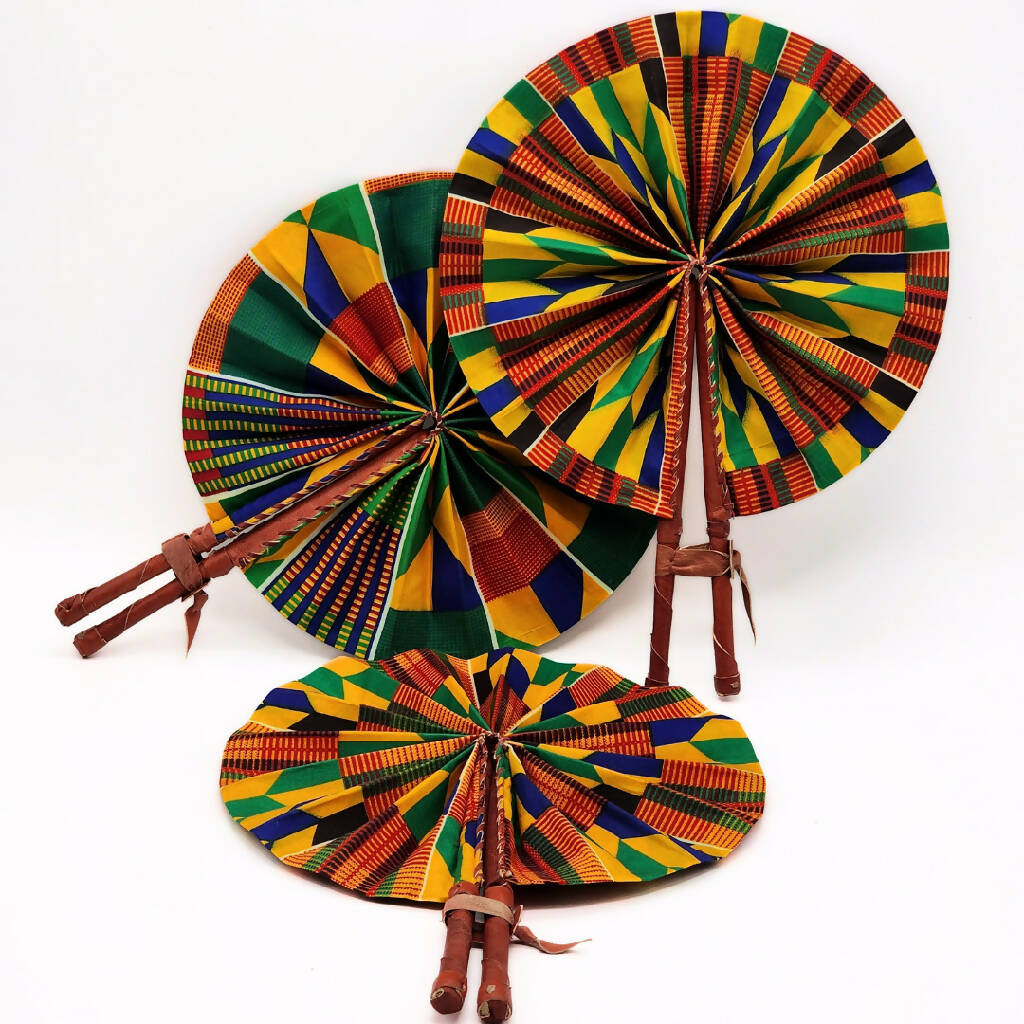 This product, Kenyan Kente Fans are for the hot weather, are a stunning accessory that are perfect for staying cool during the hot summer months. The fan's design is inspired by the traditional Kenyan Kente fabric, known for its vibrant colors and intricate patterns. It adds a unique touch to any outfit and can be used as a functional accessory or as a decorative piece.