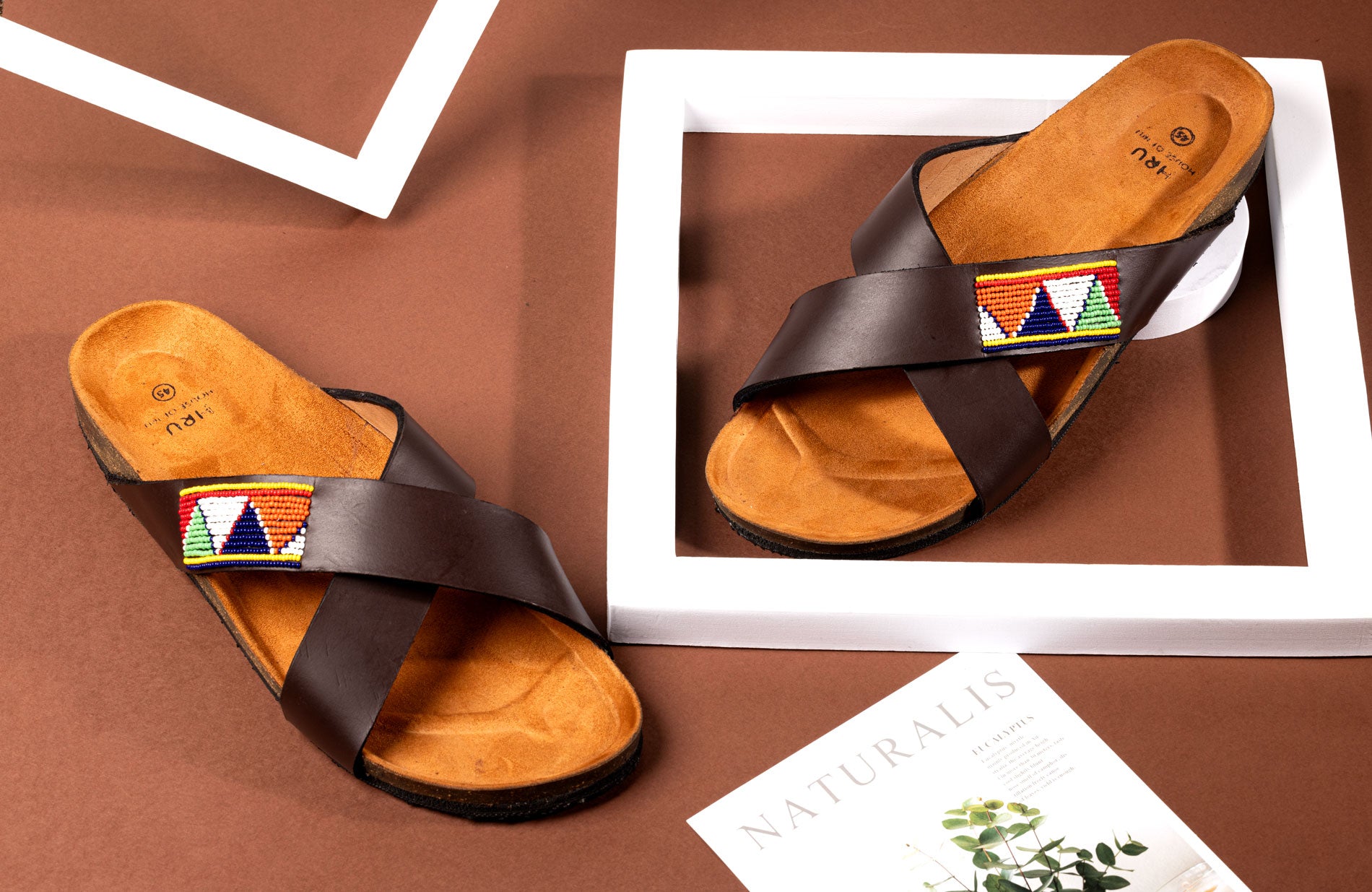 Men Leather Cork Sandals | African Beaded Sandals | Brown