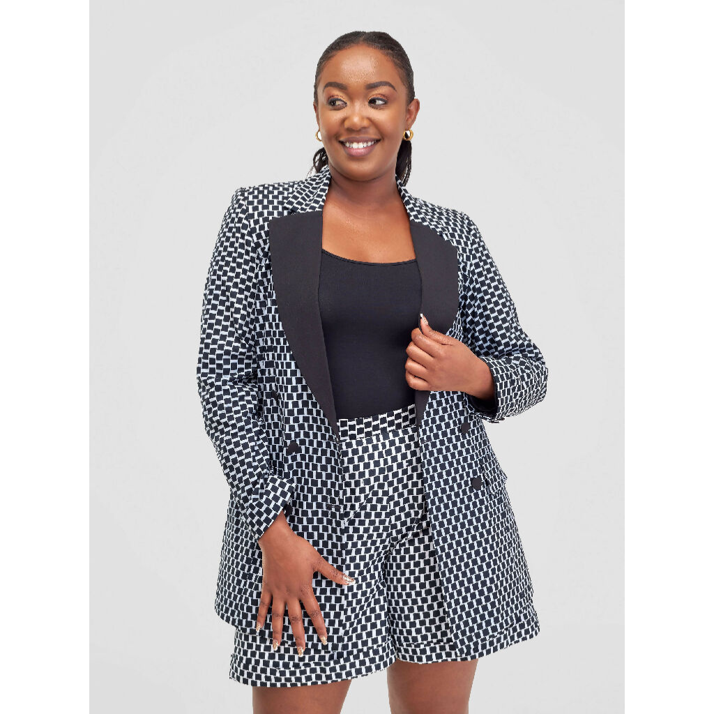 Modern meets classic: This statement-making ensemble features a sophisticated double-breasted blazer with a sleek black...