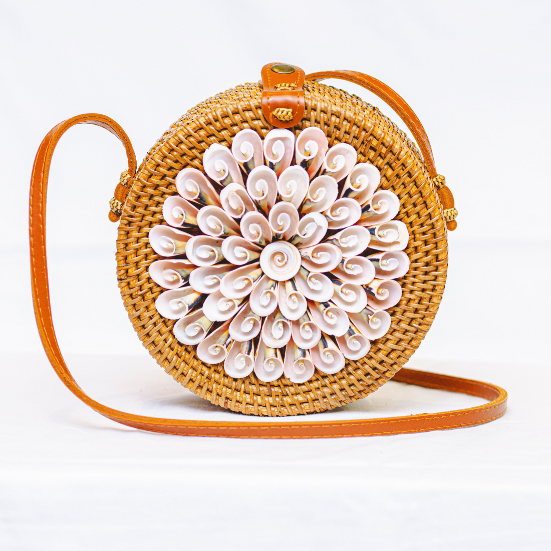 Brown Rattan Sling Bag with Collected Shells | Summer Crossbody Bag