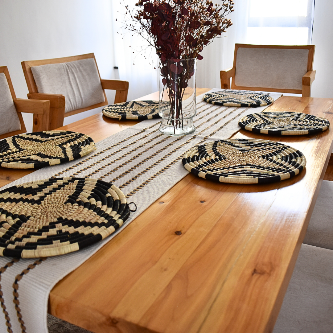A simple yet elegant addition to your home décor. Crafted from natural materials, this mat exudes a rustic elegance that complements a range of décor styles. Its neutral base with black accents effortlessly enhances the ambiance of your space, from contemporary to eclectic.