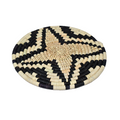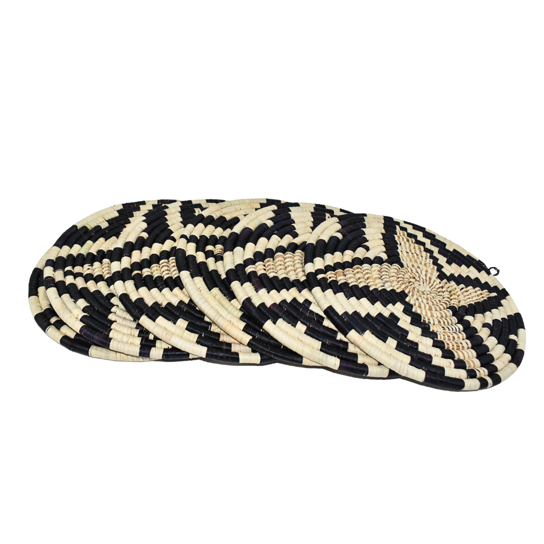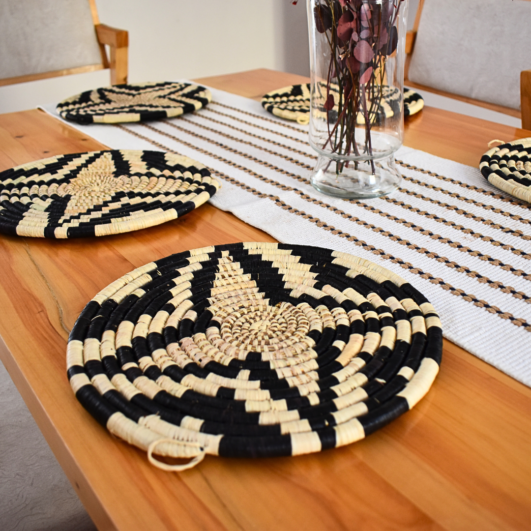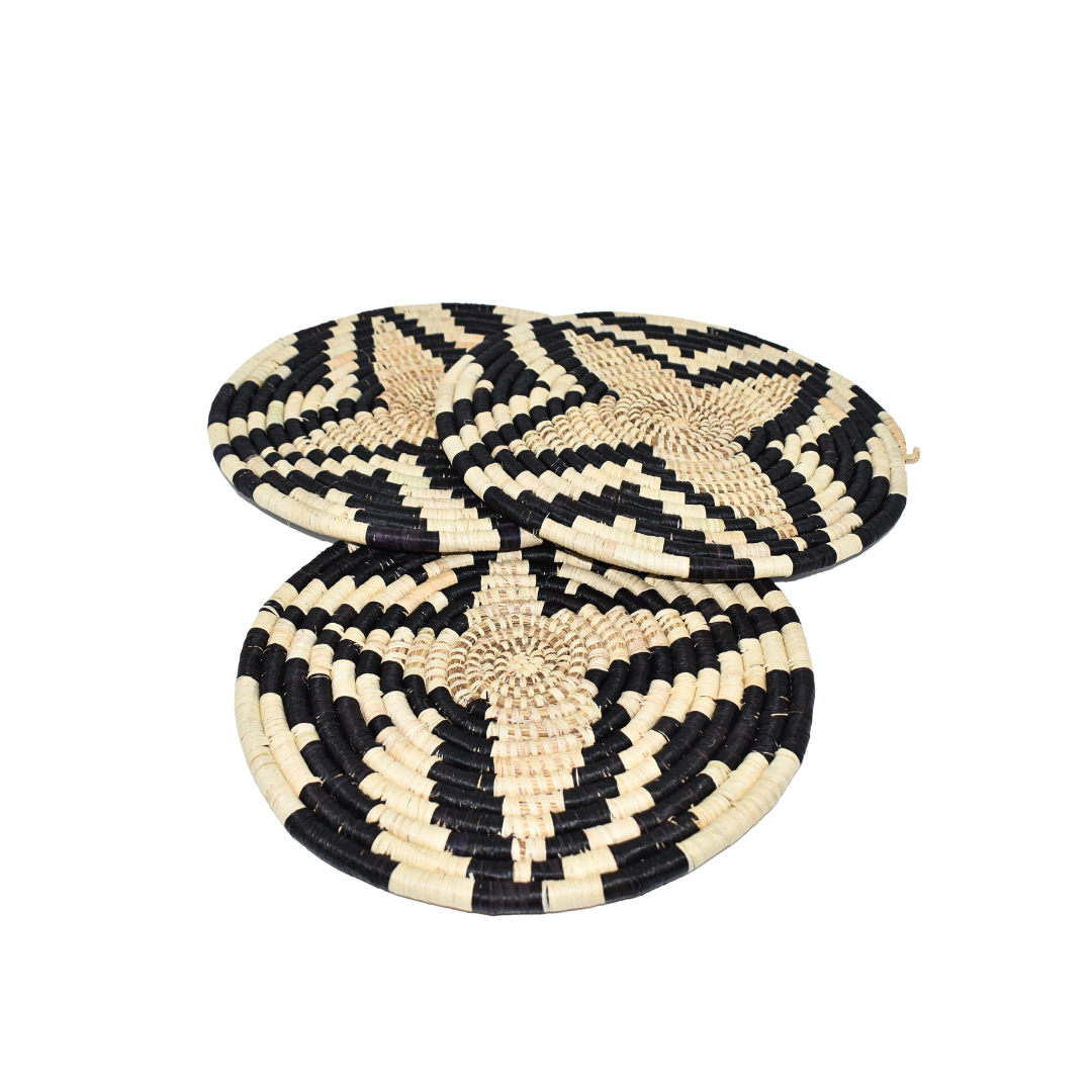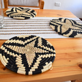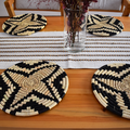 Measuring 12 inches in diameter, this versatile mat is perfect for a variety of uses. Whether used as a chic placemat for your dining table, a unique coaster for your beverages, or a decorative accent in any room, its distinctive black pattern adds an eye-catching element to any setting.