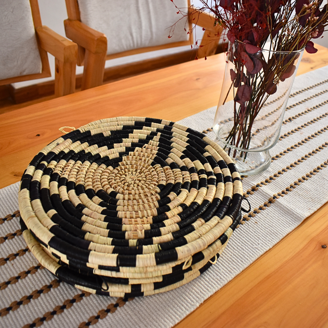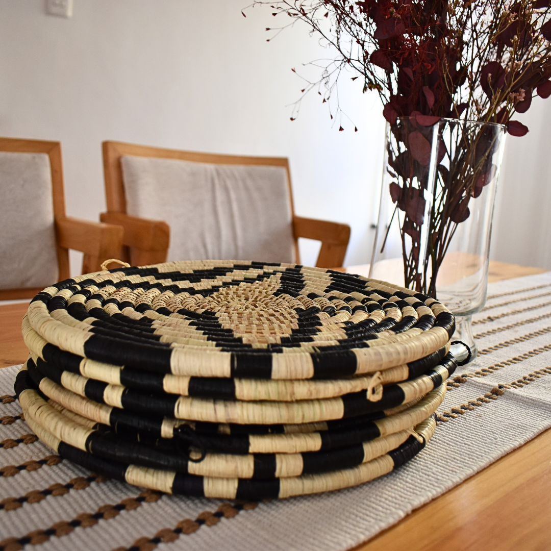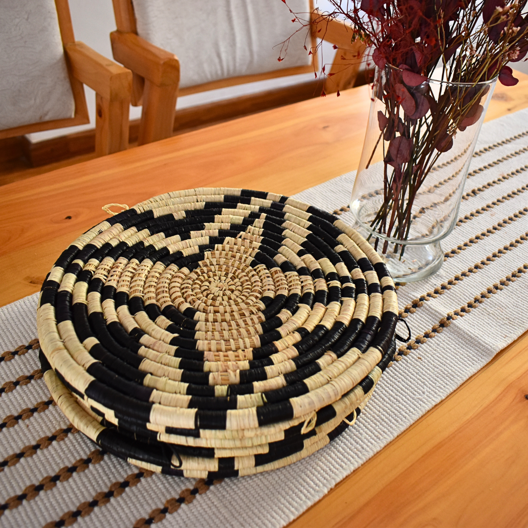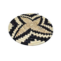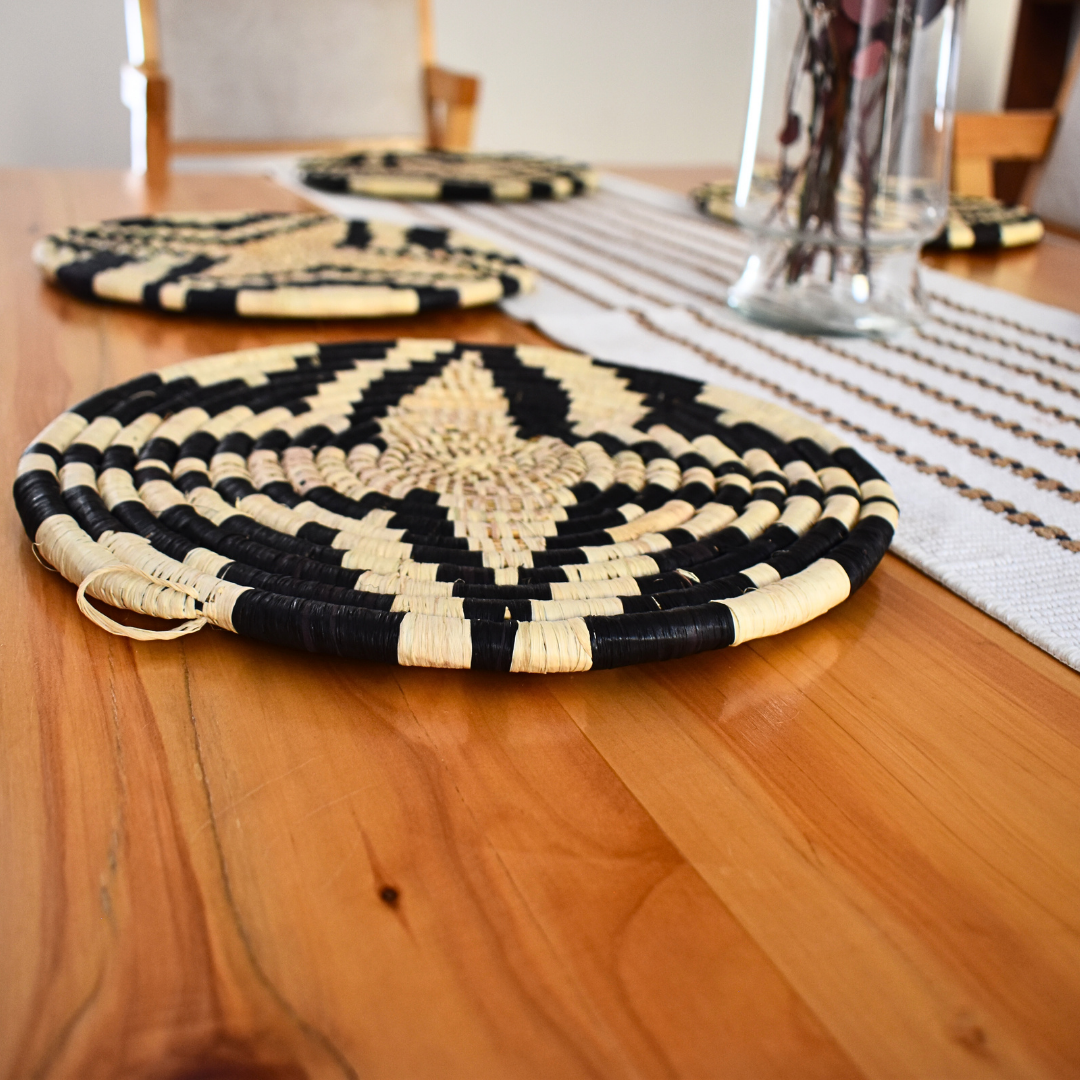 Measuring 12 inches in diameter, this versatile mat is perfect for a variety of uses. Whether used as a chic placemat for your dining table, a unique coaster for your beverages, or a decorative accent in any room, its distinctive black pattern adds an eye-catching element to any setting.