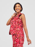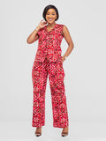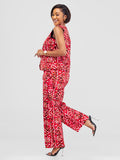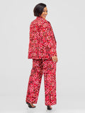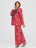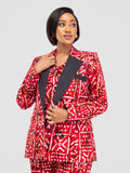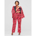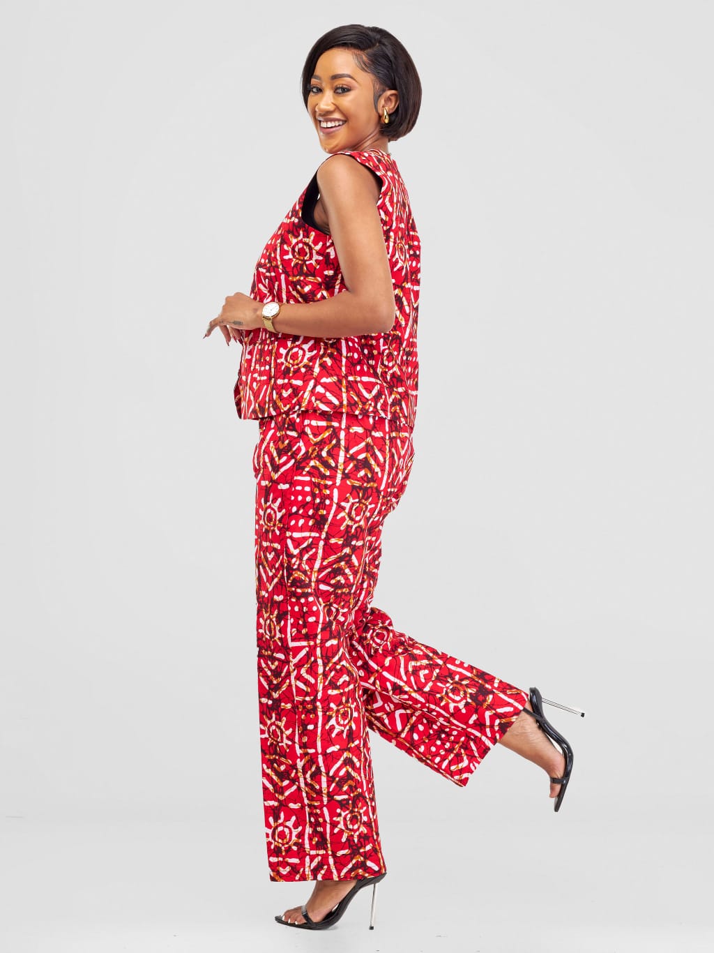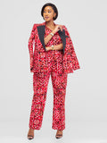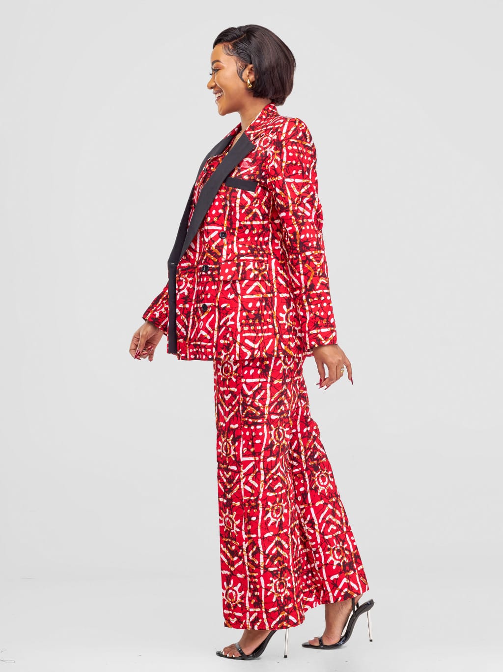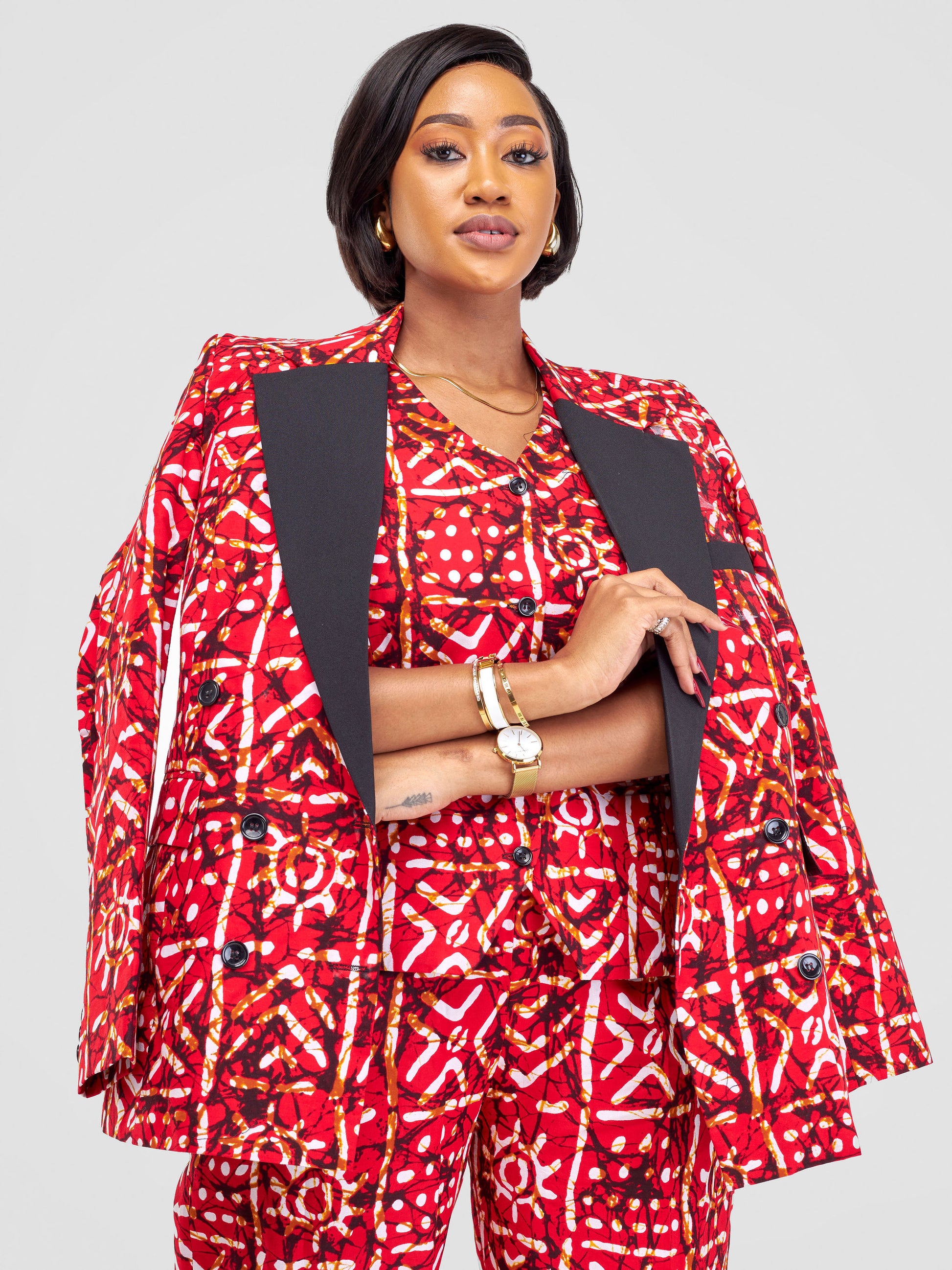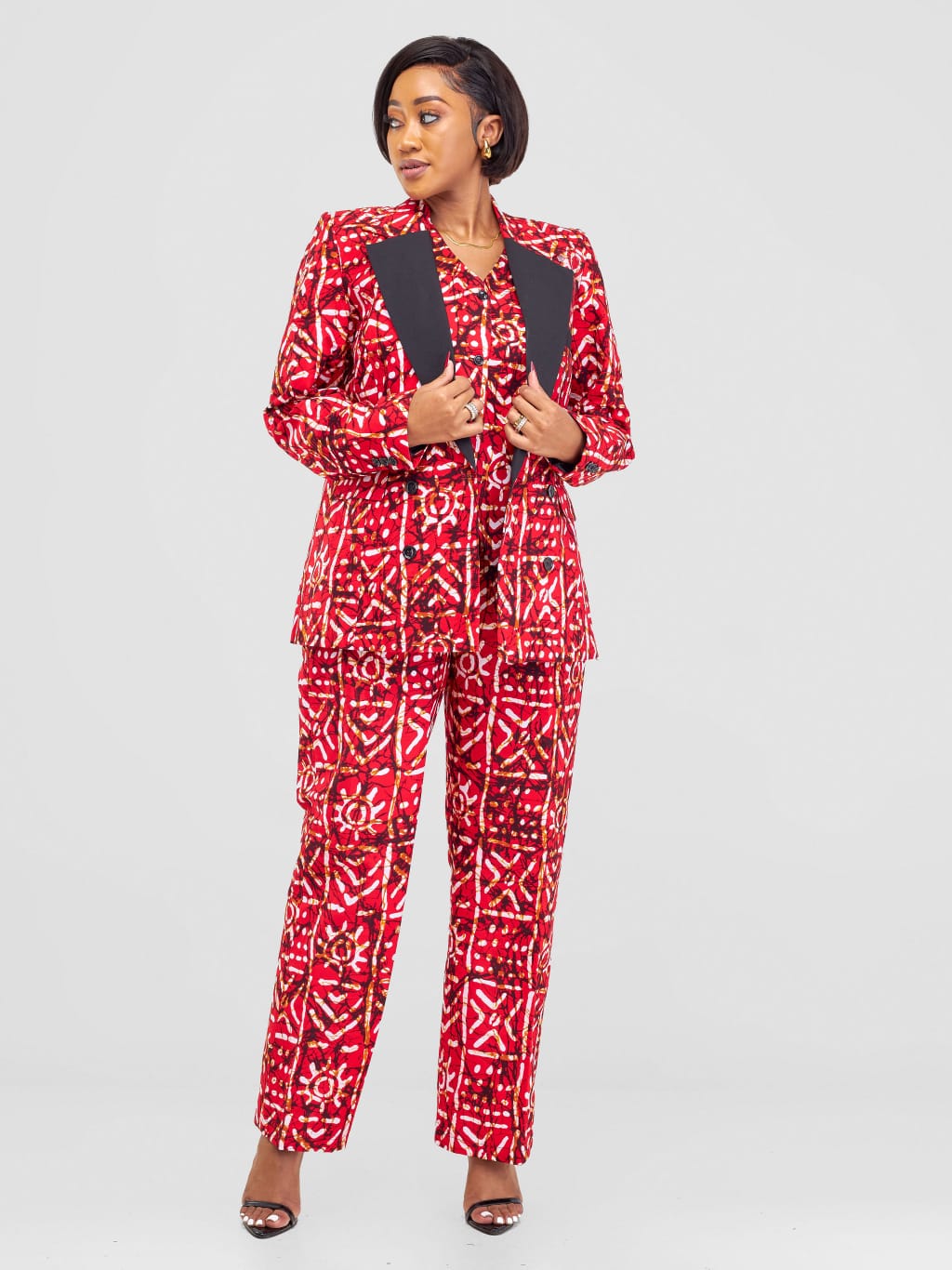 This three-piece ensemble features a sophisticated double-breasted blazer with a distinctive black lapel. Crafted from high-quality Ankara fabric, the suit boasts a captivating red tribal pattern, accented by subtle white, brown, and black hues.