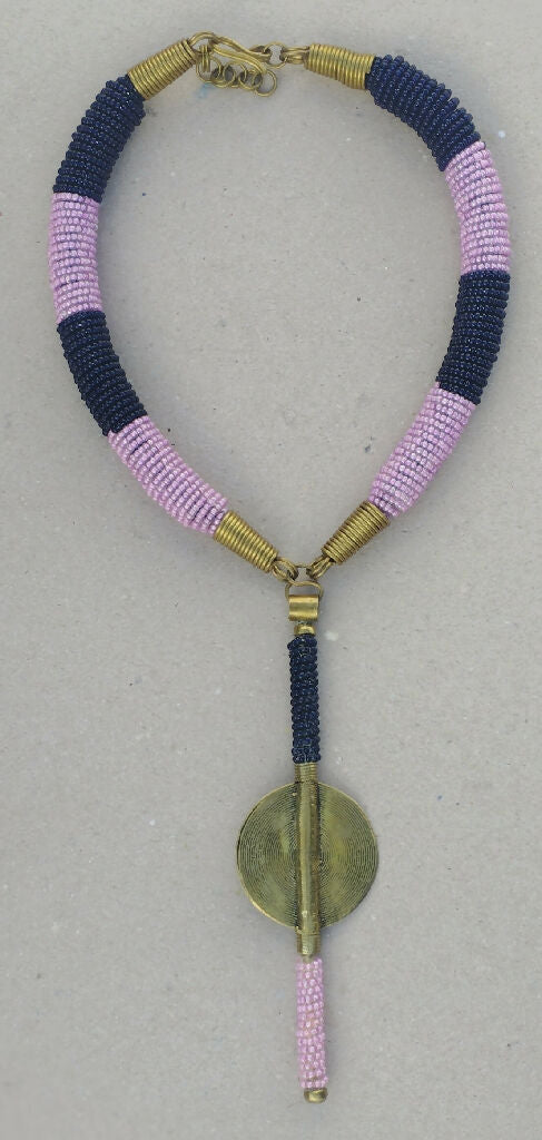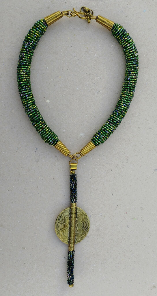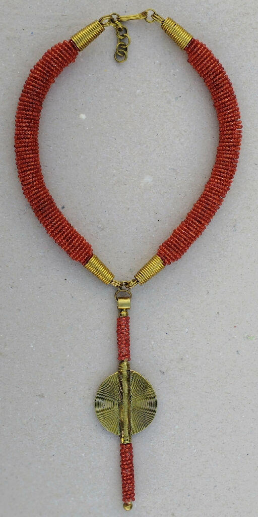 The Nubian Sun – Radiate elegance and heritage with this striking handmade necklace. Featuring a harmonious blend of vibrant beads and polished brass accents, each piece tells a story of craftsmanship and culture. Its bold design captures the warmth of the sun and the richness of Nubian artistry, making it the perfect statement accessory for any occasion.Can be custom made in any color.