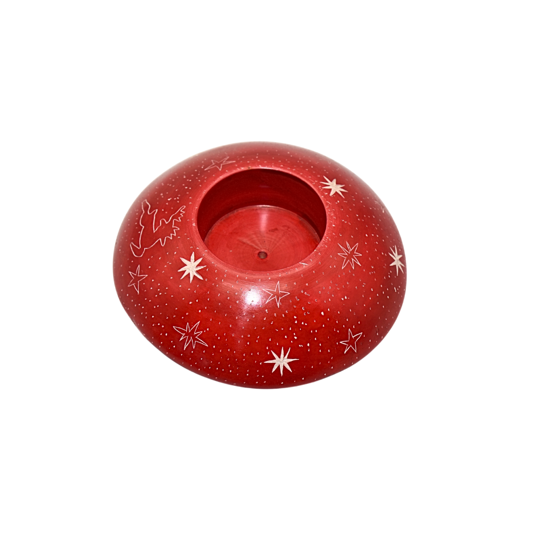 This beautiful circular candle holder is meticulously hand-carved from genuine Kenyan soapstone and finished in festive red. Each piece is a unique work of art, crafted by skilled Kenyan artisans using traditional stone-carving techniques.