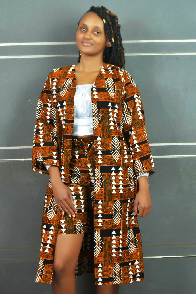 The Ankara-themed set features a lovely Ankara kimono and a pair of Ankara shorts. Both pieces are versatile: they are stunning when worn as a set and still go very well with other outfits.