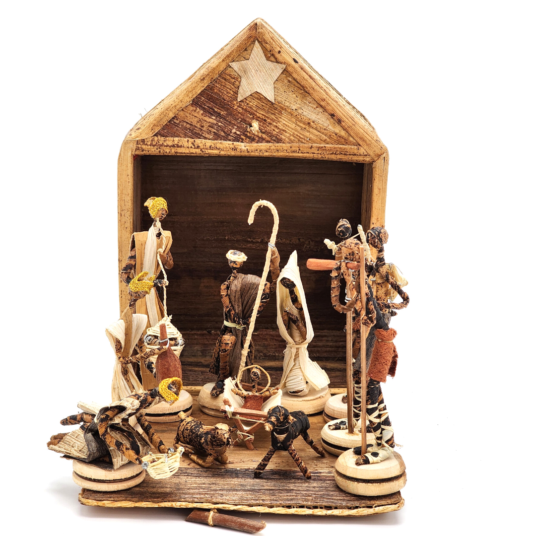 This set is handmade out of banana leafs by artisans in Kenya. It will add a magnificent décor to your home during the holidays. The faceless statues allow people to project any face they desire. The natural texture  gives it a more realistic and rustic look.
