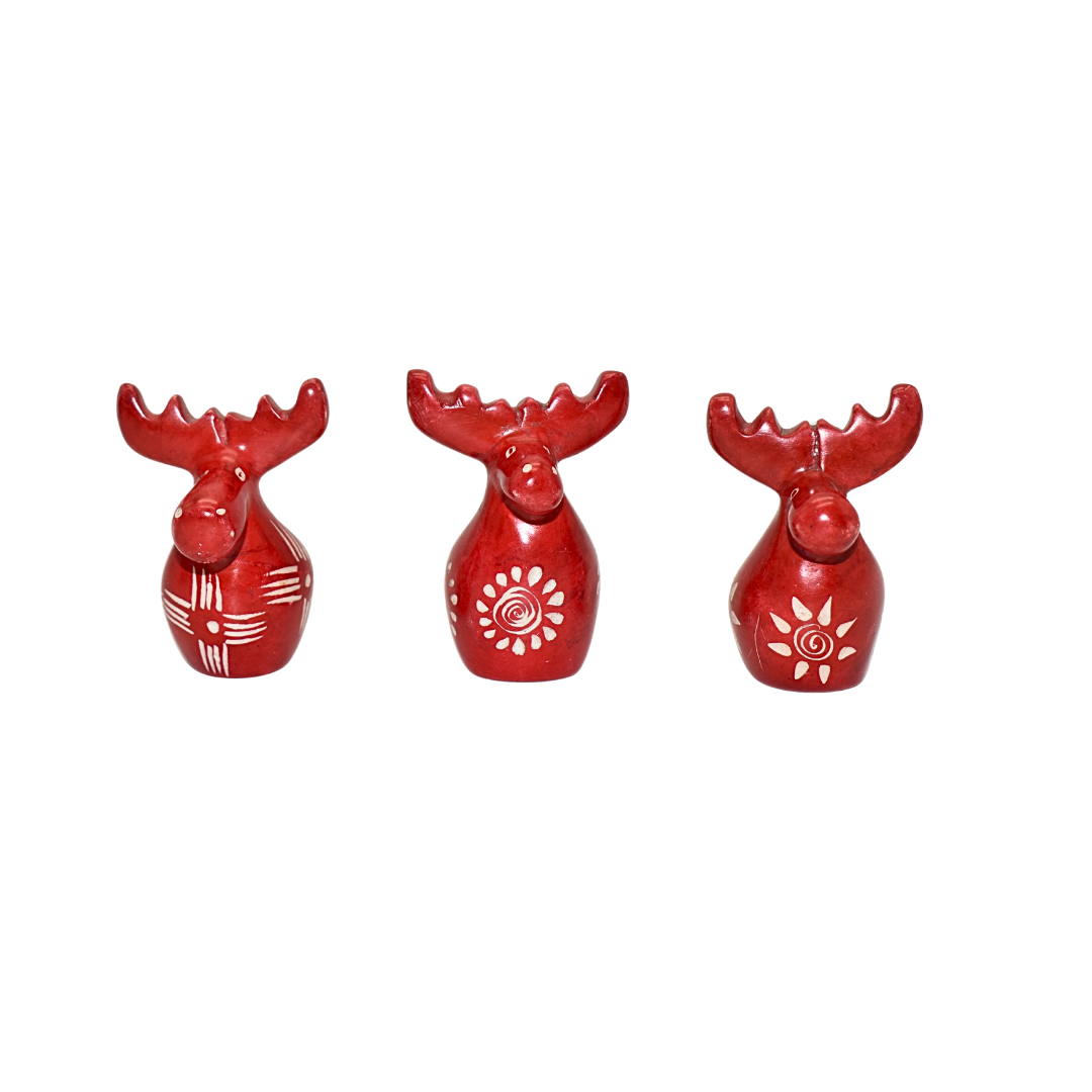 This delightful set of three small moose-shaped candle holders is hand-carved from genuine Kenyan soapstone by skilled artisans. Each charming moose adds a touch of winter woodland whimsy to your holiday décor while providing a functional spot for tea lights or small candles. The compact size makes them perfect for creating festive displays throughout your home, and the set of three allows you to group them together for maximum impact or scatter them across different spaces to spread holiday cheer.