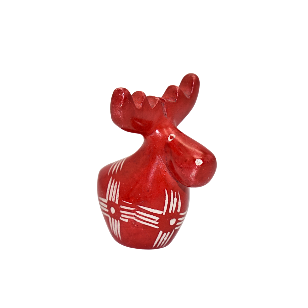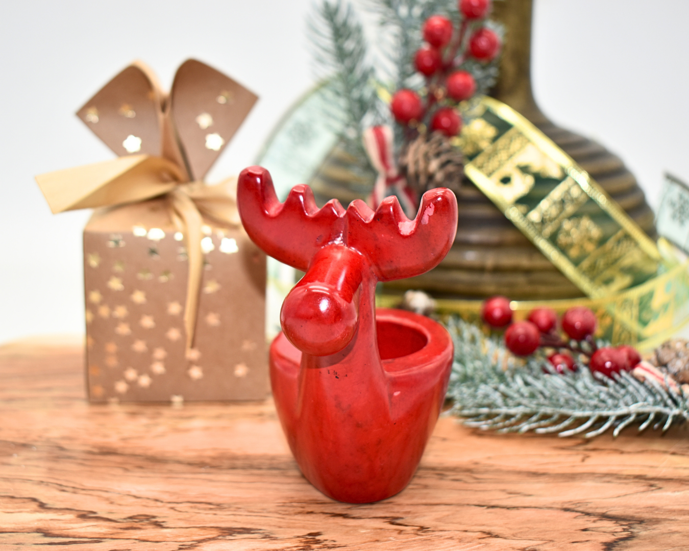 Moose are iconic symbols of winter and the holiday season, evoking images of snowy forests and cozy celebrations. These charming moose candle holders bring that festive, rustic touch to any space. The natural beauty of Kenyan soapstone provides an earthy, organic feel that complements both traditional and modern holiday décor, while the moose shape adds personality and seasonal character. Each piece is hand-carved, making every moose slightly unique with natural variations in the stone's color and grain. The small size makes them incredibly versatile—perfect for holiday mantels, festive dining tables, bathroom counters, bedside tables, or anywhere you want to add a cozy glow and a touch of winter woodland charm.
