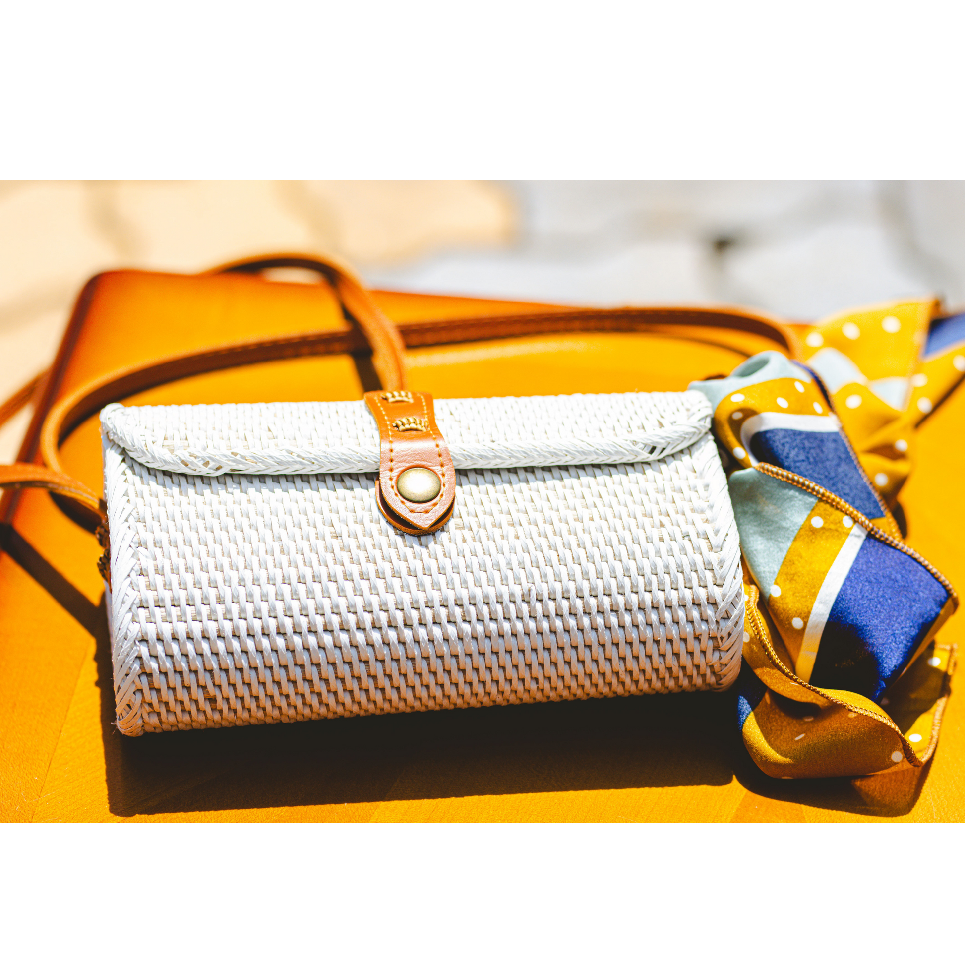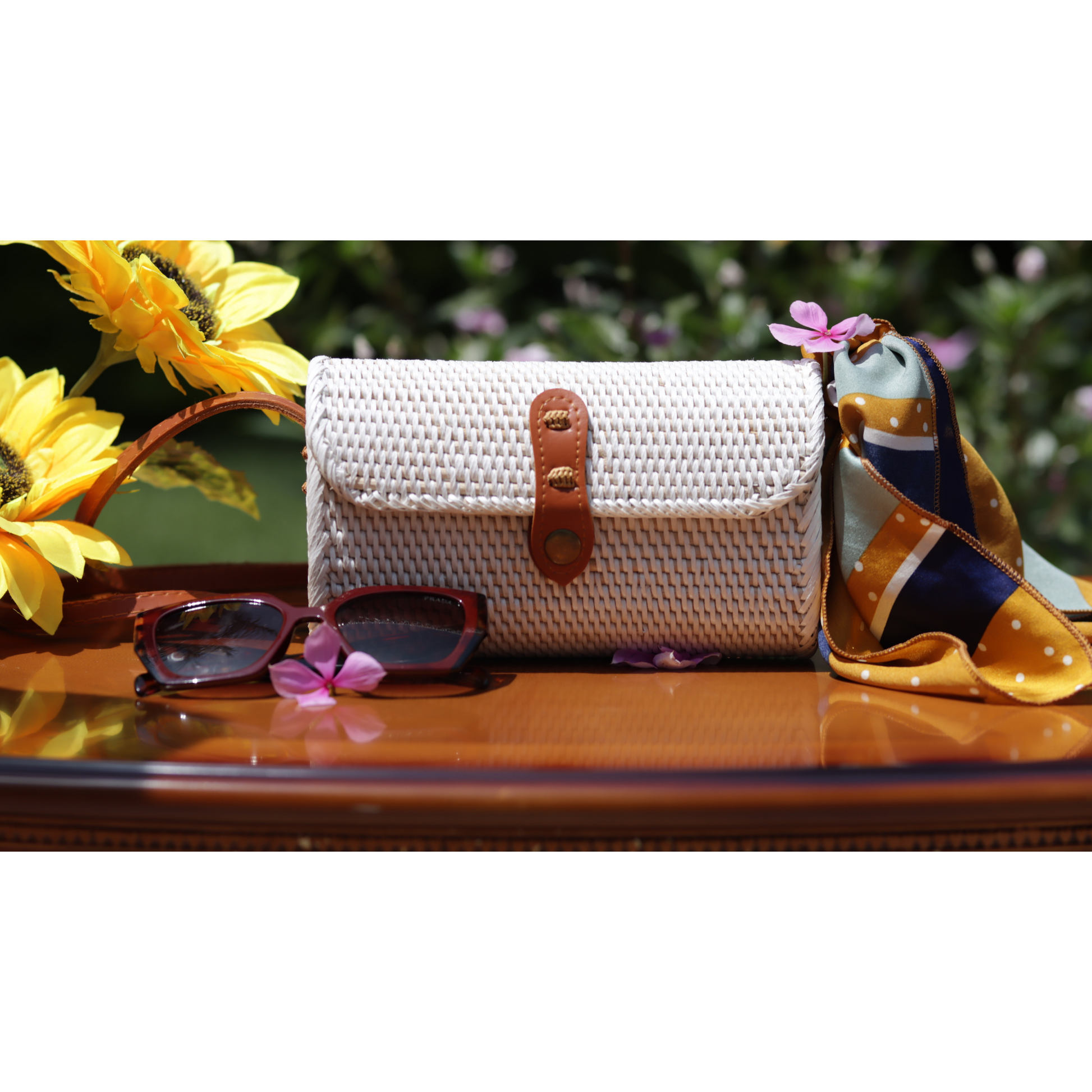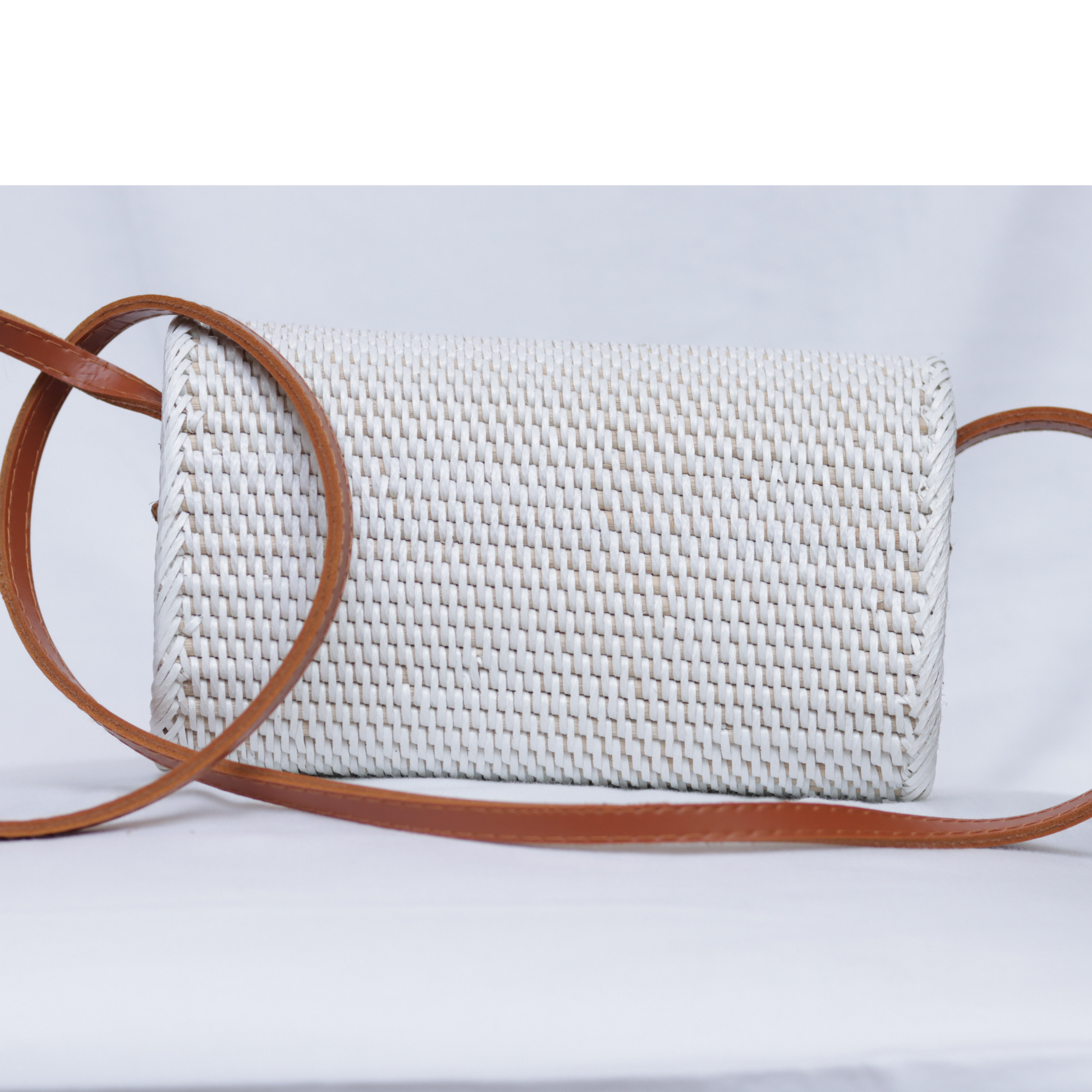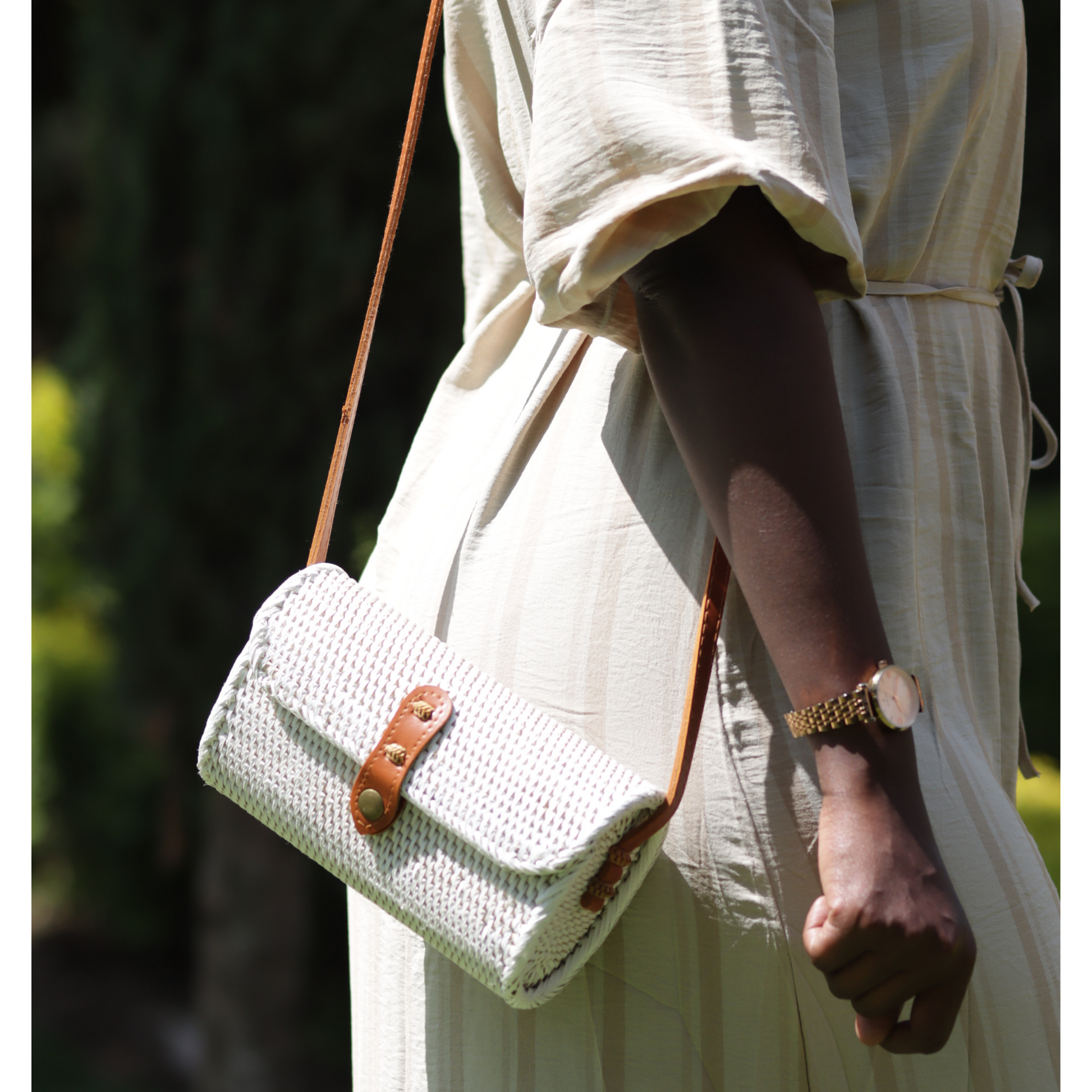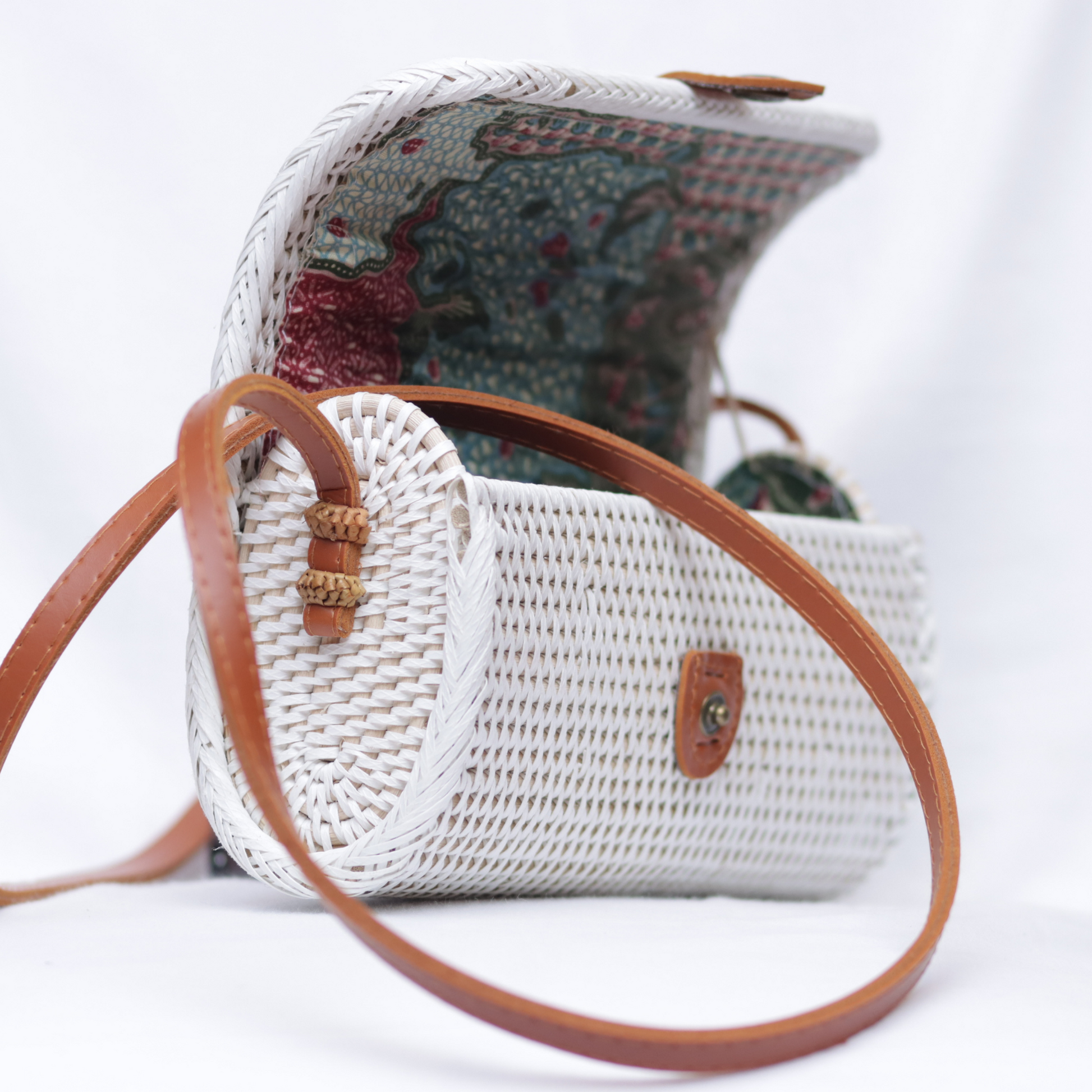 Handwoven from natural rattan fibers, it's lightweight yet incredibly durable, ensuring it can keep up with your weekend getaways and sun-soaked summer adventures.  It is lined with a protective colorful cotton fabric that adds a vibrant touch to the bag, making it even more eye-catching. Its long leather strap allows you to comfortably carry it as a sling bag, leaving your hands free to explore. The natural, minimalist design showcases the beauty of sustainable materials, highlighting the eco-conscious nature of this piece.