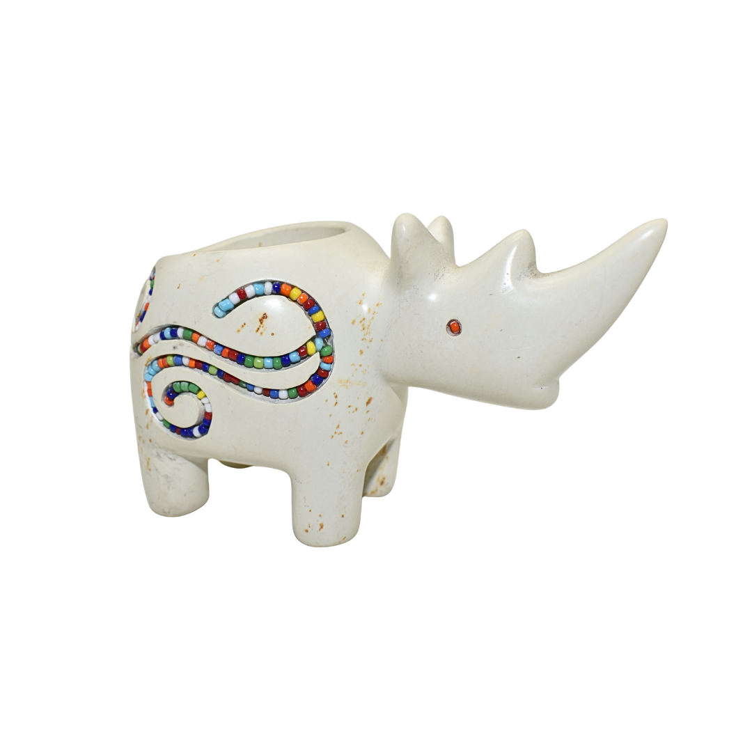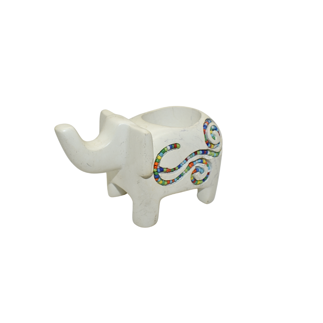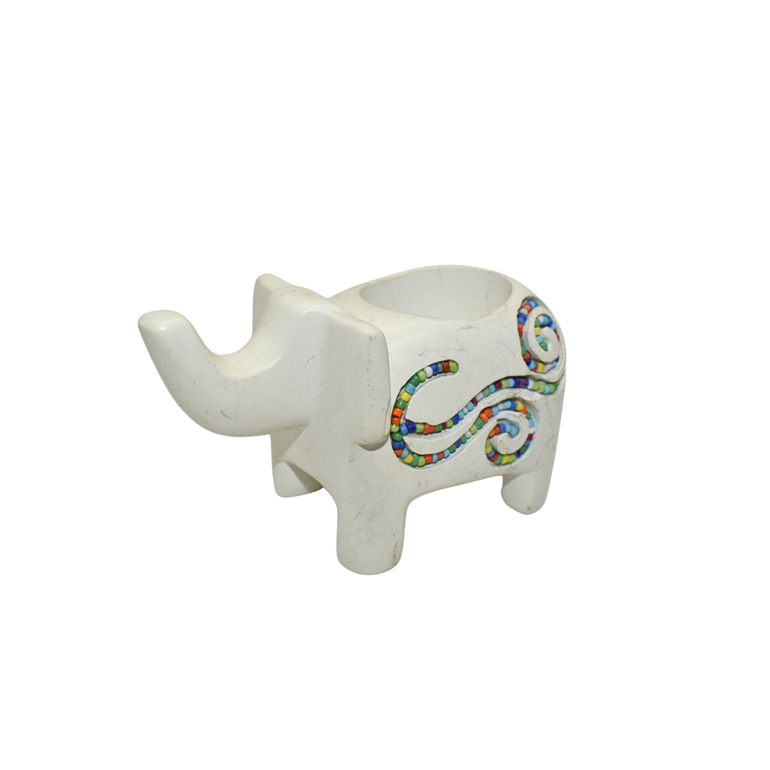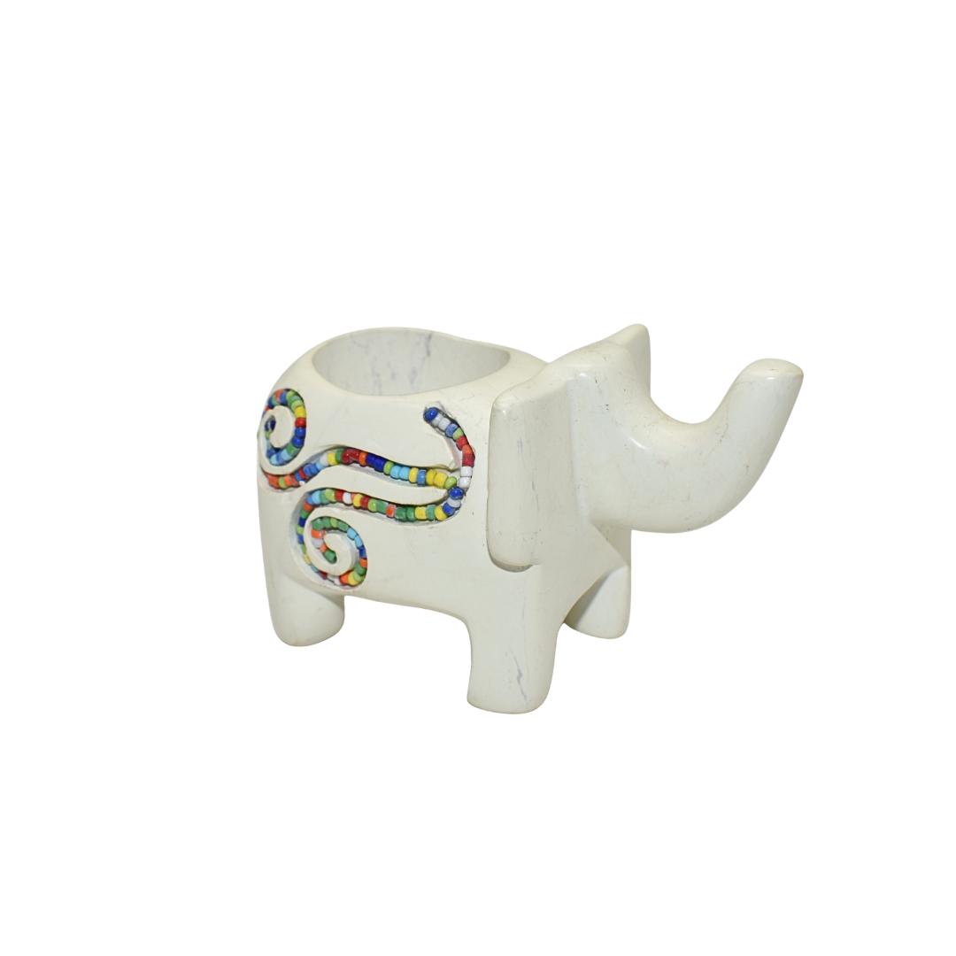 These animal candle holders are a beautiful fusion of wildlife artistry, cultural heritage, and practical function. The rhino and elephant shapes celebrate Africa's iconic wildlife, bringing a touch of safari elegance to your space. The natural soapstone provides a durable, heat-resistant base for candles, while the Maasai beadwork adds vibrant color and cultural character. Each piece is hand-carved and individually beaded, making it unique with natural variations in the stone's color and beadwork patterns. The natural tones of the soapstone—ranging from creamy whites to soft grays—provide an organic, elegant backdrop for the colorful beads.