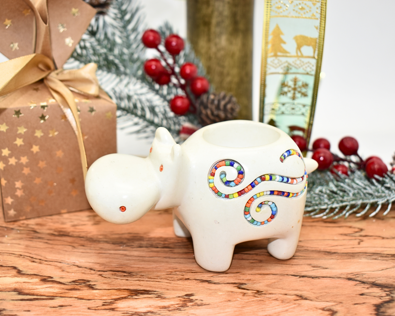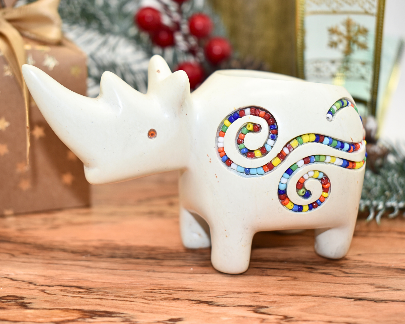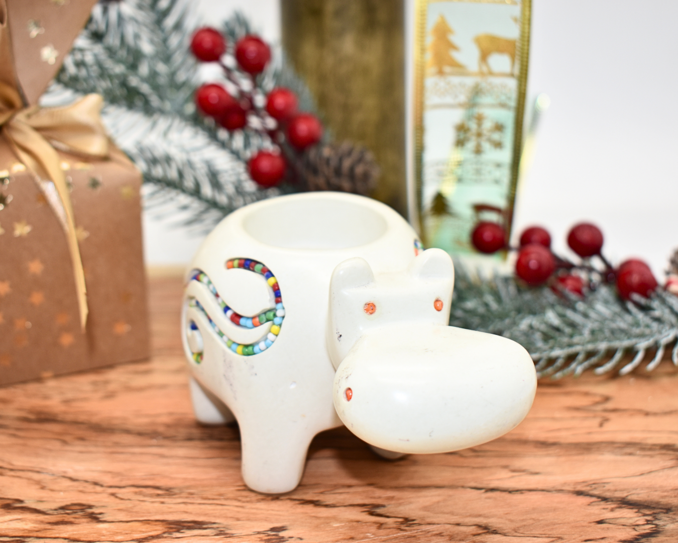 These animal candle holders are a beautiful fusion of wildlife artistry, cultural heritage, and practical function. The rhino and elephant shapes celebrate Africa's iconic wildlife, bringing a touch of safari elegance to your space. The natural soapstone provides a durable, heat-resistant base for candles, while the Maasai beadwork adds vibrant color and cultural character. Each piece is hand-carved and individually beaded, making it unique with natural variations in the stone's color and beadwork patterns. The natural tones of the soapstone—ranging from creamy whites to soft grays—provide an organic, elegant backdrop for the colorful beads.