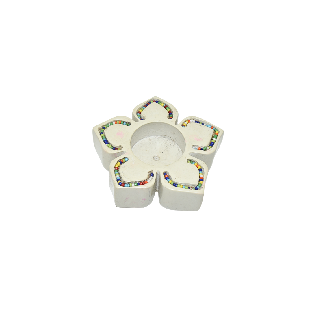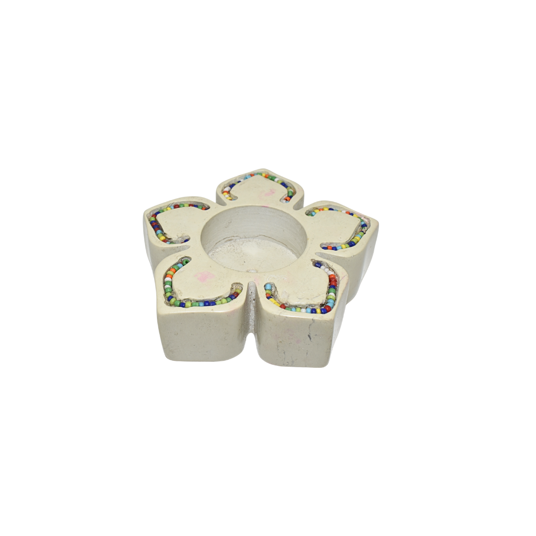 This star candle holder is a beautiful fusion of form, function, and cultural artistry. The star shape is a design that adds visual interest from every angle, while the natural soapstone provides a durable, heat-resistant base for candles. The Maasai beadwork adds vibrant color and cultural character, transforming a simple candle holder into a work of art. Each piece is hand-carved and individually beaded, making it unique with natural variations in the stone's color and beadwork patterns. The natural tones of the soapstone—ranging from creamy whites to soft grays—provide an organic, elegant backdrop for the colorful beads.