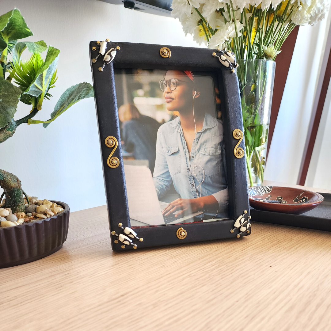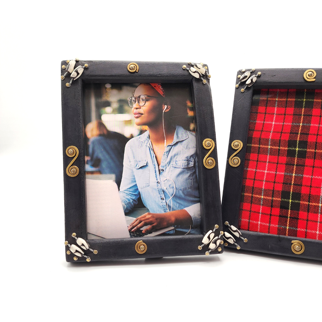 This unique wooden photo frame is a beautiful addition to any space. Handcrafted by artisans in a local Kenyan community, each frame is one of a kind.